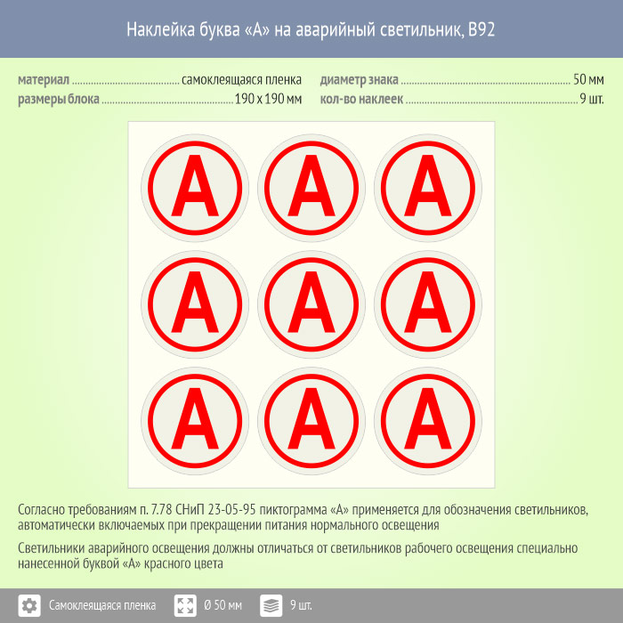 Наклейка буква «А» на аварийный светильник, B92 (пленка, диаметр 50 мм, блок 9 штук, 190х190 мм) в Волгограде купить