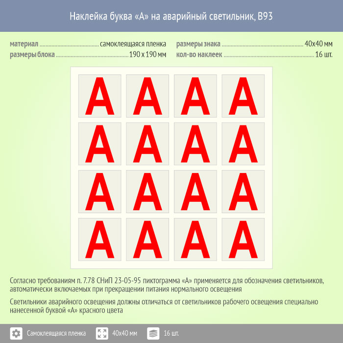 Наклейка буква «А» на аварийный светильник, B93 (пленка, 40х40 мм, блок 16 штук, 190х190 мм) в Волгограде купить