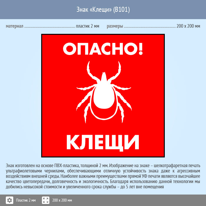 Знак «Опасно! Клещи», B101 (пластик, 200х200 мм) в Волгограде купить
