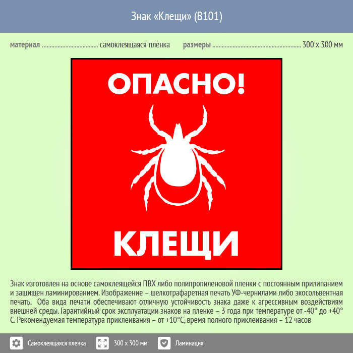 Знак «Опасно! Клещи», B101 (пленка c ламинированием, 300х300 мм) в Волгограде купить