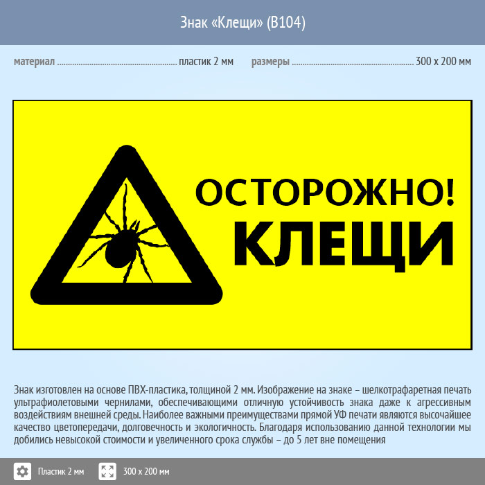 Знак «Осторожно! Клещи», B104 (пластик, 400х300 мм) в Волгограде купить