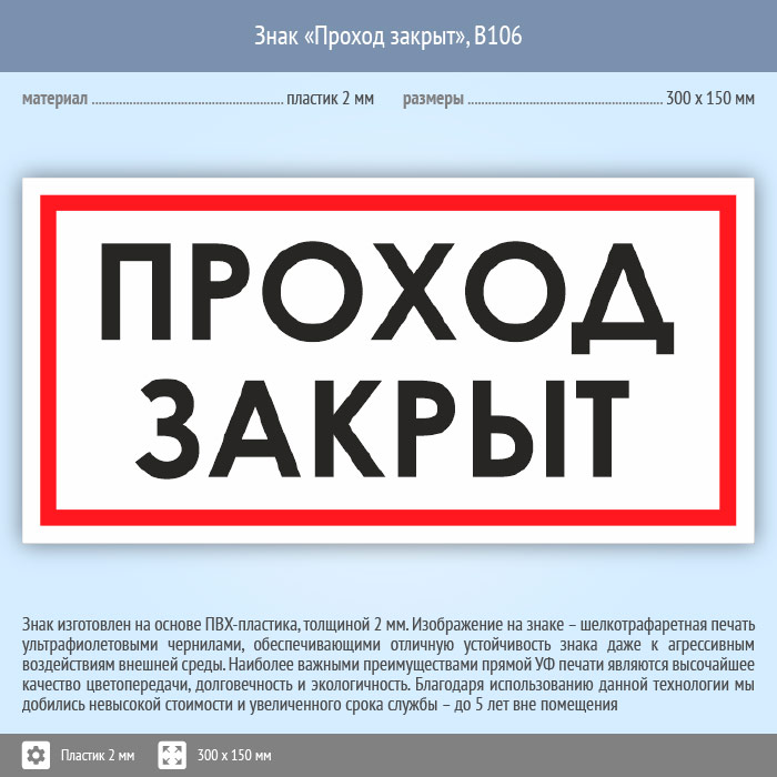 Знак «Проход закрыт», B106 (пластик, 300х150 мм) в Волгограде купить
