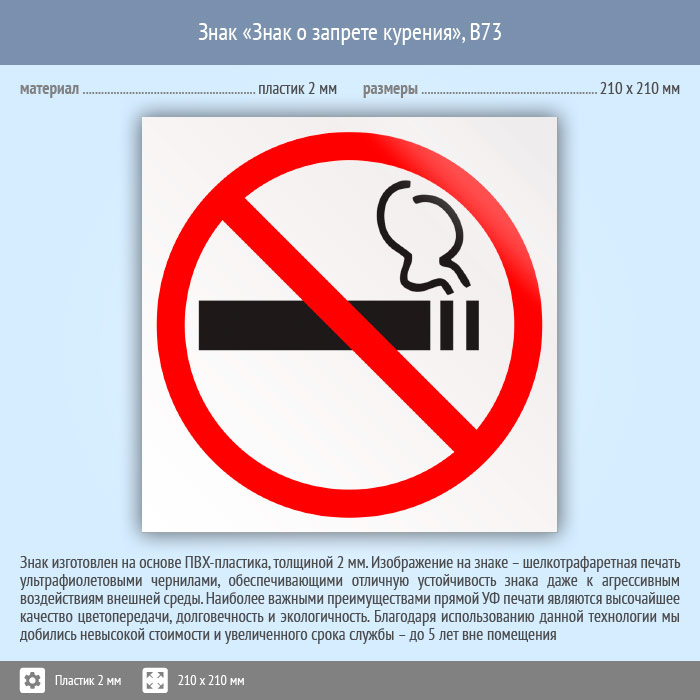 Знак «Знак о запрете курения», B73 (пластик, 210х210 мм) в Волгограде купить