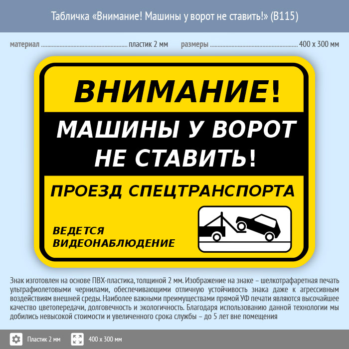 Табличка «Внимание! Машины у ворот не ставить!», B115 (пластик, 400х300 мм) в Волгограде купить