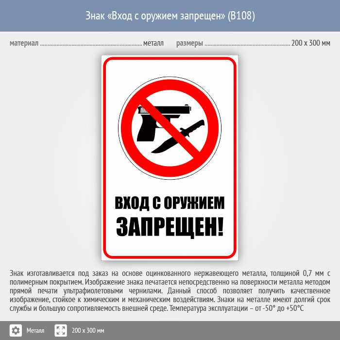 Знак «Вход с оружием запрещен», B108 (металл, 200х300 мм) в Волгограде купить
