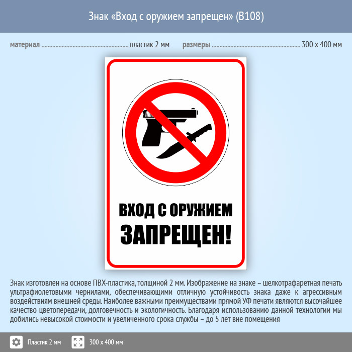 Знак «Вход с оружием запрещен», B108 (пластик, 300х400 мм) в Волгограде купить