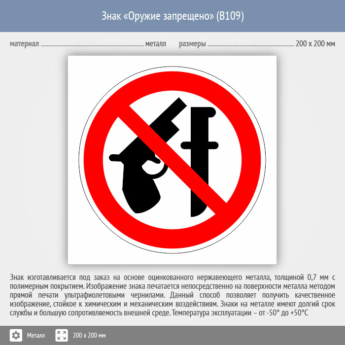 Знак «Оружие запрещено», B109 (металл, 200х200 мм) в Волгограде купить
