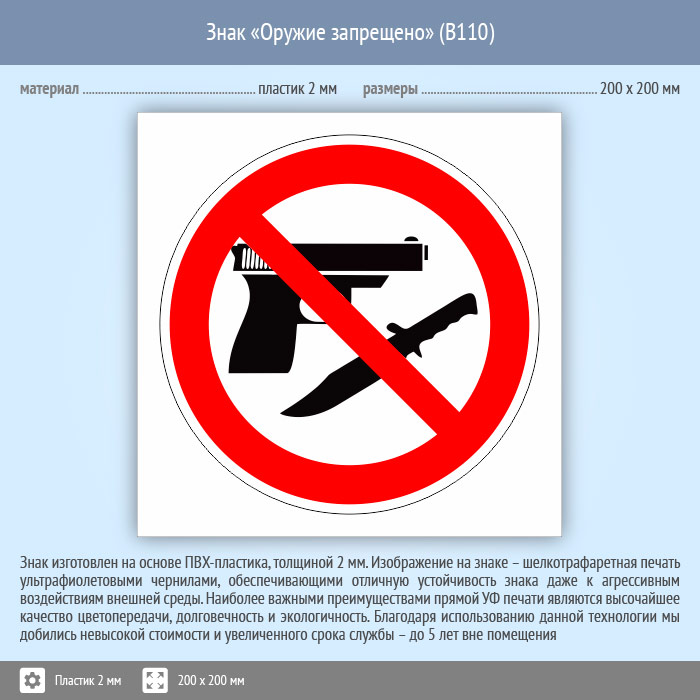 Знак «Оружие запрещено», B110 (пластик, 200х200 мм) в Волгограде купить