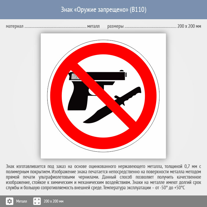 Знак «Оружие запрещено», B110 (металл, 200х200 мм) в Волгограде купить