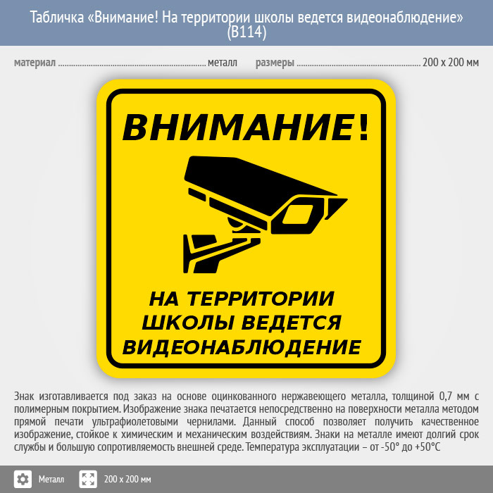 Табличка «Внимание! На территории школы ведется видеонаблюдение», B114 (металл, 200х200 мм) в Волгограде купить