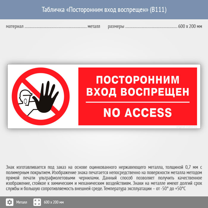 Табличка «Посторонним вход воспрещен», B111 (металл, 600х200 мм) в Волгограде купить