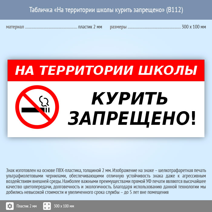 Табличка «На территории школы курить запрещено», B112 (пластик, 300х100 мм) в Волгограде купить