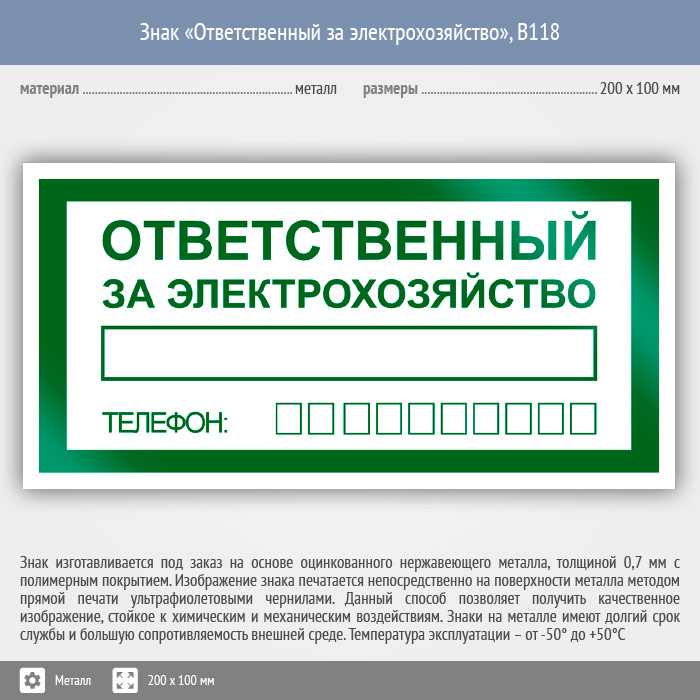 Знак «Ответственный за электрохозяйство», B118 (металл, 200х100 мм) в Волгограде купить