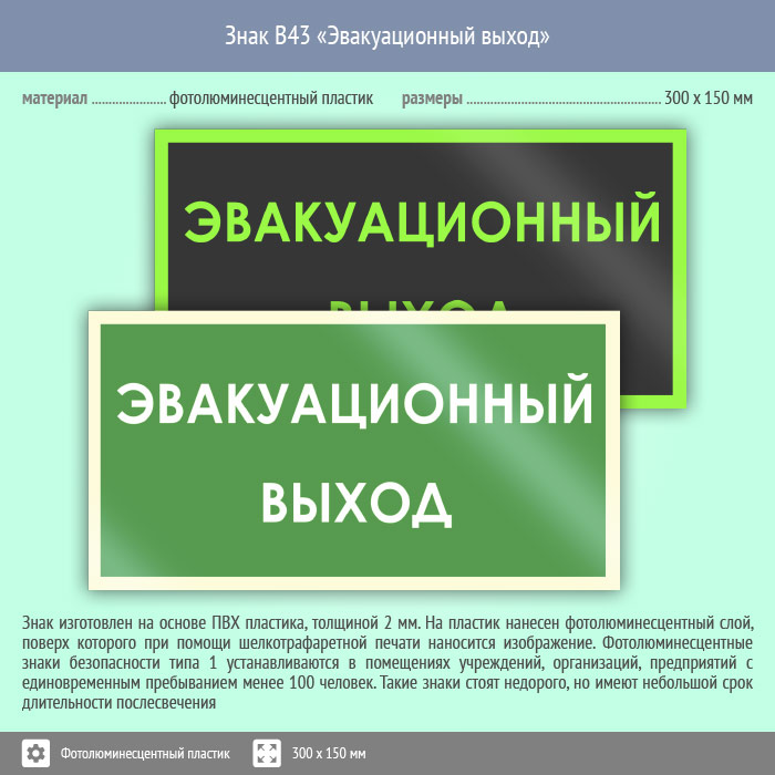 Знак B43 «Эвакуационный выход» (фотолюминесцентный пластик, 300х150 мм) в Волгограде купить