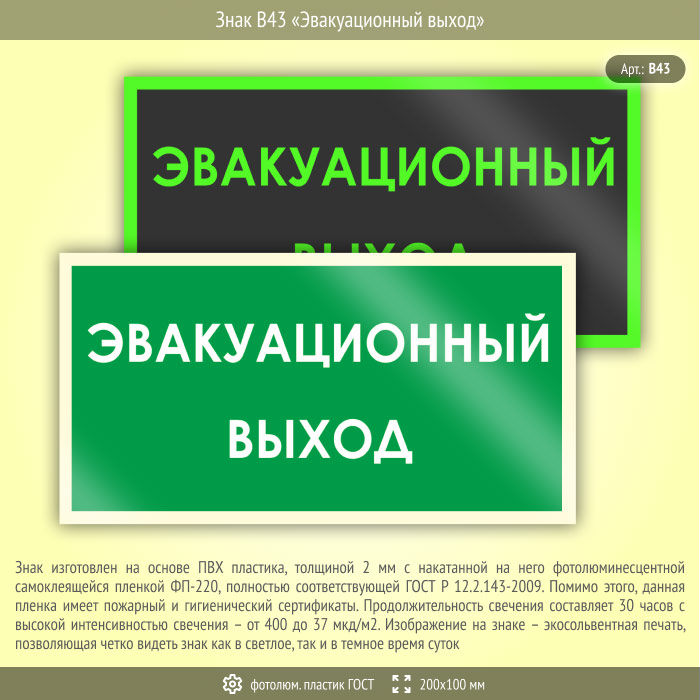 Знак B43 «Эвакуационный выход» (фотолюминесцентный пластик ГОСТ 34428-2018, 200х100 мм) в Волгограде купить