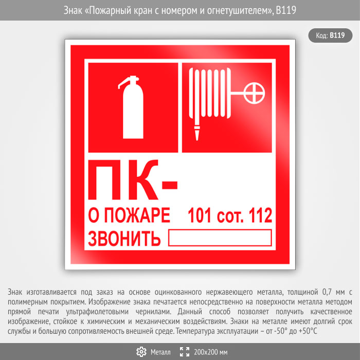 Знак «Пожарный кран с номером и огнетушителем», B119 (металл, 200х200 мм) в Волгограде купить