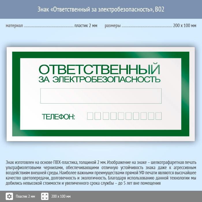 Знак «Ответственный за электробезопасность», B02 (пластик, 200х100 мм) в Волгограде купить