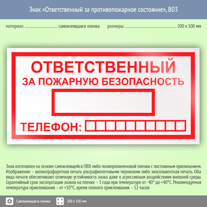 Знак «Ответственный за пожарную безопасность», B03 (пленка, 200х100 мм) в Волгограде купить