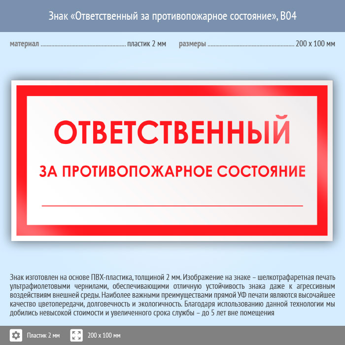 Знак «Ответственный за противопожарное состояние», B04 (пластик, 200х100 мм) в Волгограде купить