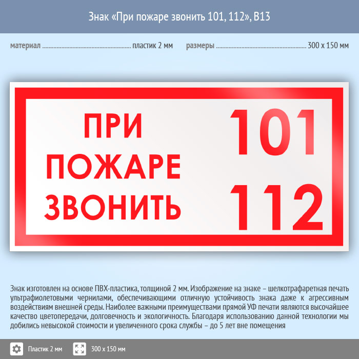 Знак «При пожаре звонить 101, 112», B13 (пластик, 300х150 мм) в Волгограде купить