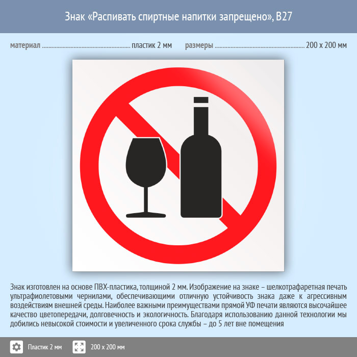 Знак «Распивать спиртные напитки запрещено», B27 (пластик, 200х200 мм) в Волгограде купить