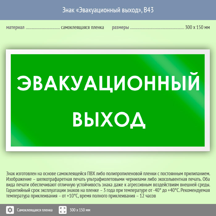 Знак «Эвакуационный выход», B43 (пленка, 300х150 мм) в Волгограде купить