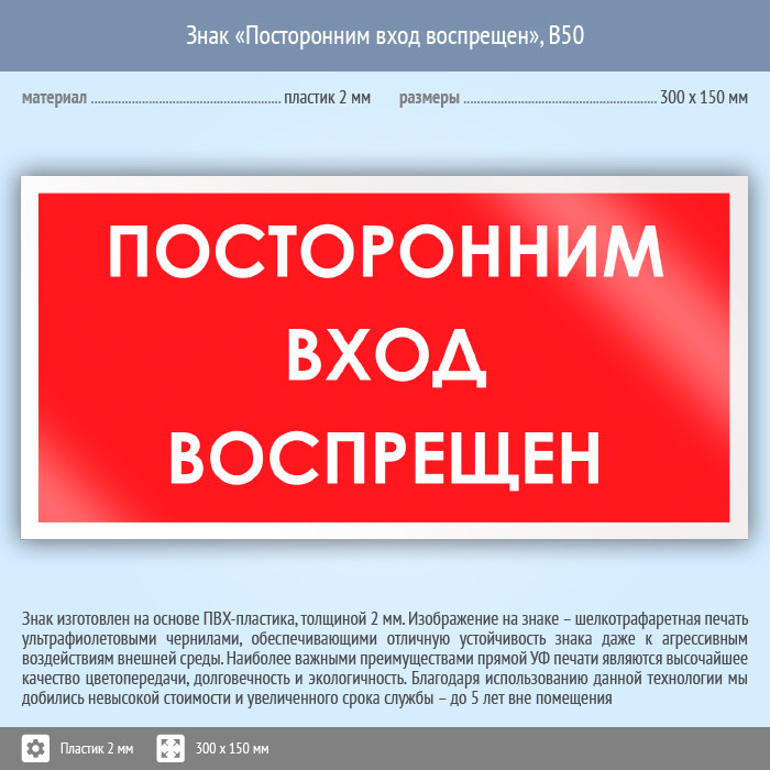 Знак «Посторонним вход воспрещен», B50 (пластик, 300х150 мм) в Волгограде купить