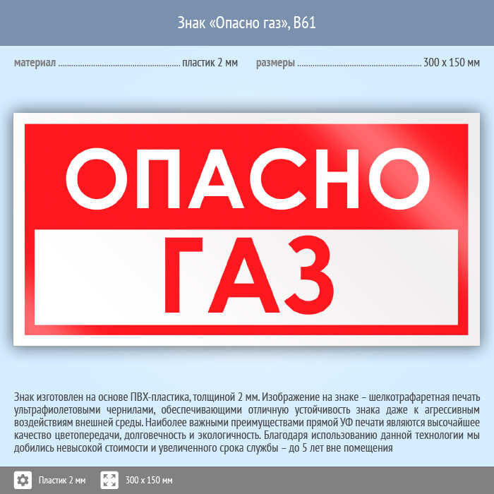 Знак «Опасно газ», B61 (пластик, 300х150 мм) в Волгограде купить