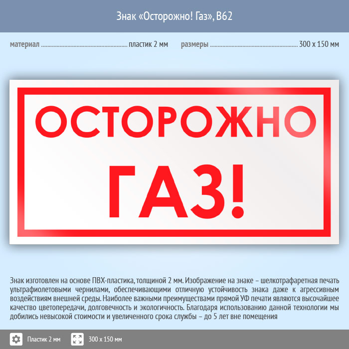 Знак «Осторожно! Газ», B62 (пластик, 300х150 мм) в Волгограде купить