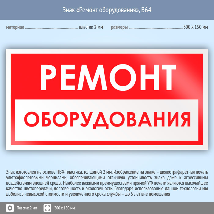Знак «Ремонт оборудования», B64 (пластик, 300х150 мм) в Волгограде купить