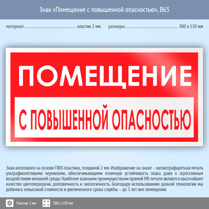 Знак «Помещение с повышенной опасностью», B65 (пластик, 300х150 мм) в Волгограде купить