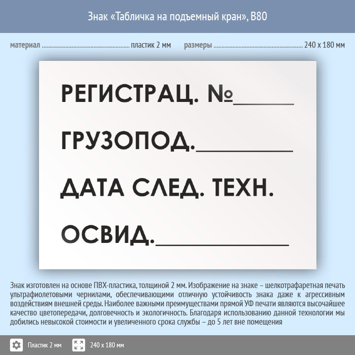 Знак «Табличка на подъемный кран», B80 (пластик, 240х180 мм) в Волгограде купить