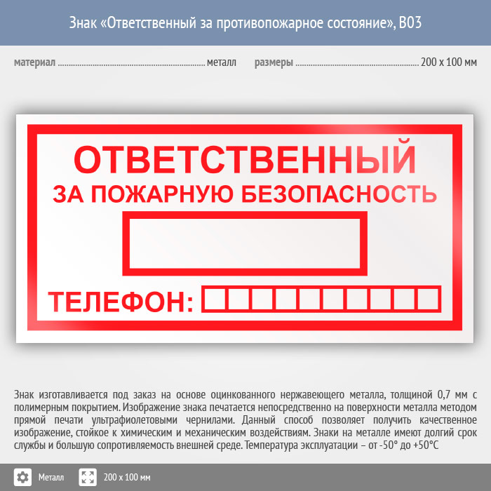 Знак «Ответственный за пожарную безопасность», B03 (металл, 200х100 мм) в Волгограде купить
