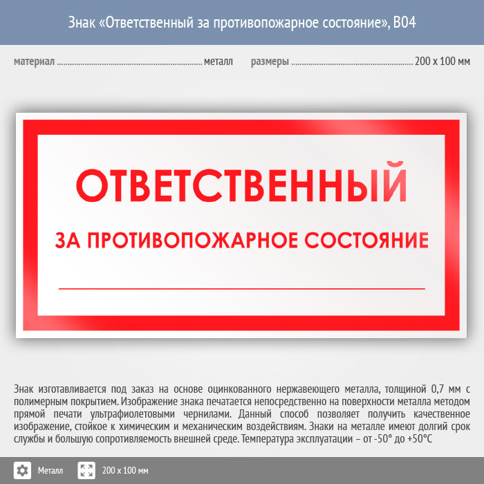 Знак «Ответственный за противопожарное состояние», B04 (металл, 200х100 мм) в Волгограде купить