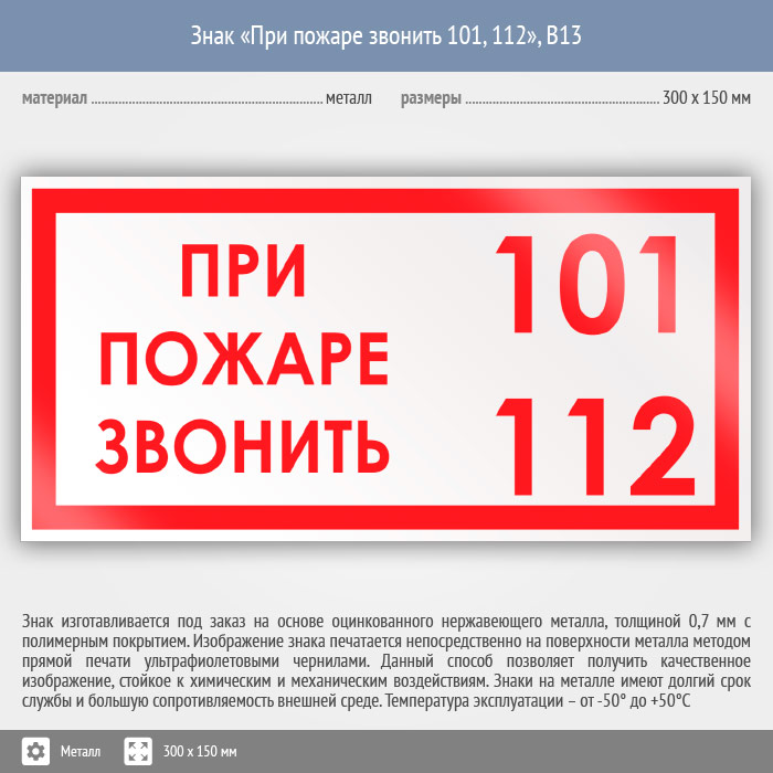 Знак «При пожаре звонить 101, 112», B13 (металл, 300х150 мм) в Волгограде купить