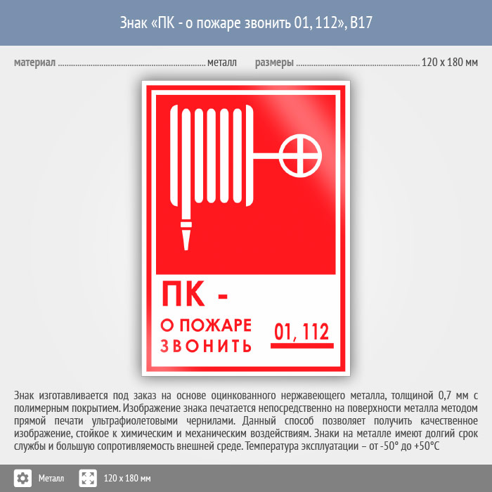 Знак «ПК - о пожаре звонить 01, 112», B17 (металл, 120х180 мм) в Волгограде купить