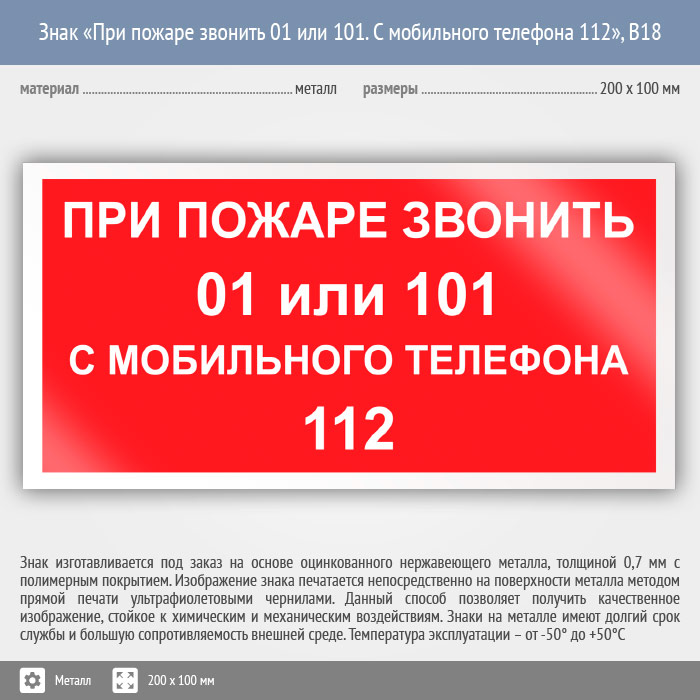 Знак «При пожаре звонить 01 или 101. С мобильного телефона 112», B18 (металл, 200х100 мм) в Волгограде купить