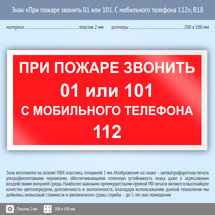 Знак «При пожаре звонить 01 или 101. С мобильного телефона 112», B18 (пластик, 200х100 мм) в Волгограде купить