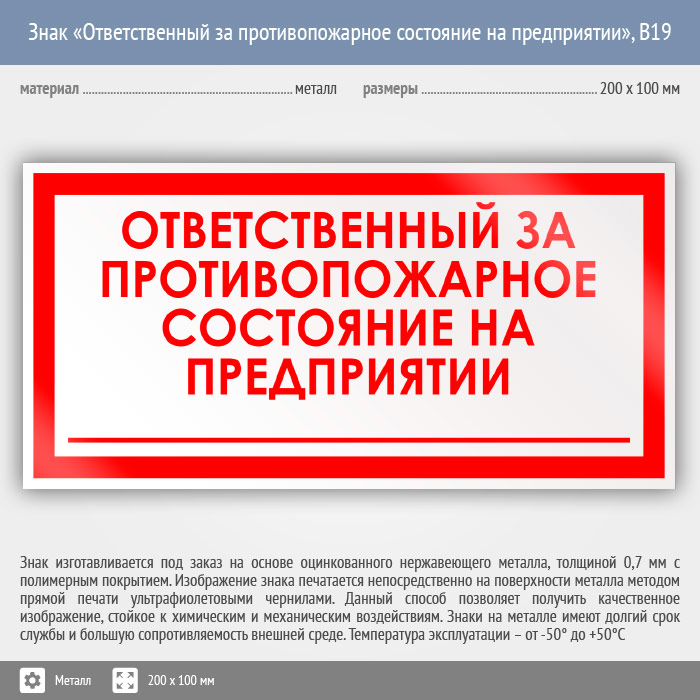 Знак «Ответственный за противопожарное состояние на предприятии», B19 (металл, 200х100 мм) в Волгограде купить