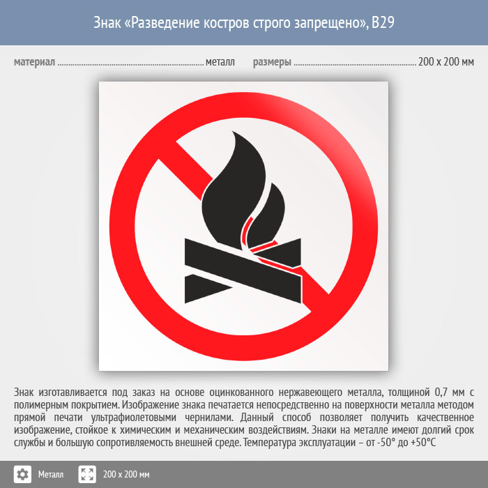 Знак «Разведение костров строго запрещено», B29 (металл, 200х200 мм) в Волгограде купить