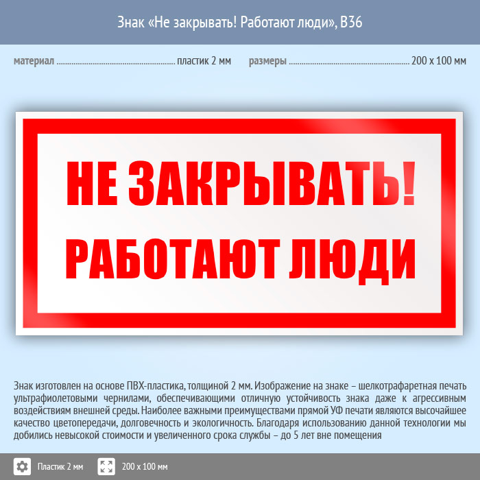 Знак «Не закрывать! Работают люди», B36 (пластик, 200х100 мм) в Волгограде купить