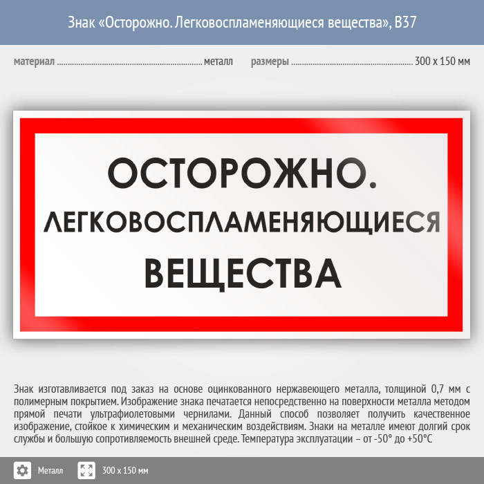 Знак «Осторожно. Легковоспламеняющиеся вещества», B37 (металл, 300х150 мм) в Волгограде купить