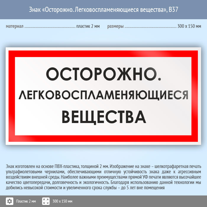 Знак «Осторожно. Легковоспламеняющиеся вещества», B37 (пластик, 300х150 мм) в Волгограде купить