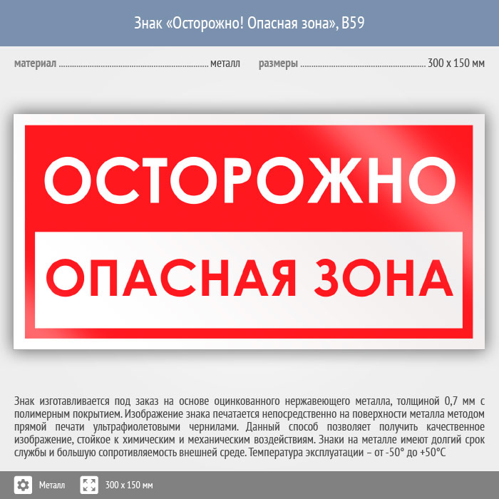 Знак «Осторожно! Опасная зона», B59 (металл, 300х150 мм) в Волгограде купить
