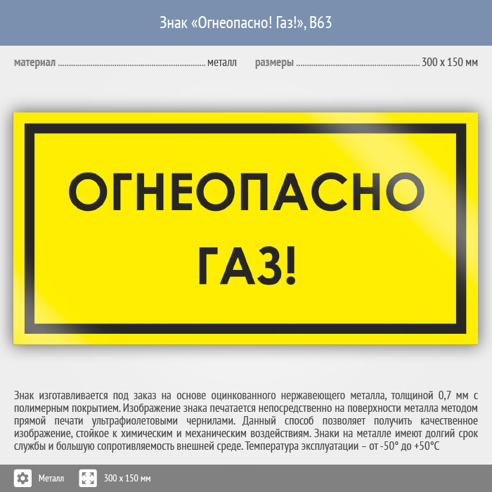 Знак «Огнеопасно! Газ!», B63 (металл, 300х150 мм) в Волгограде купить