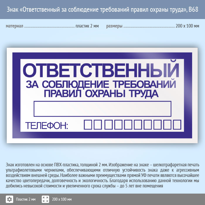 Знак «Ответственный за соблюдение требований правил охраны труда», B68 (пластик, 200х100 мм) в Волгограде купить