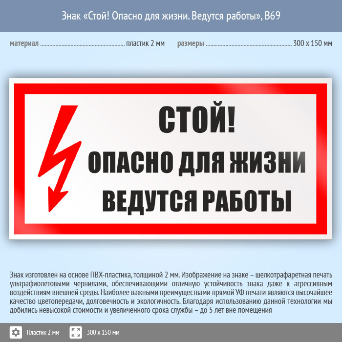 Знак «Стой! Опасно для жизни. Ведутся работы», B69 (пластик, 300х150 мм) в Волгограде купить