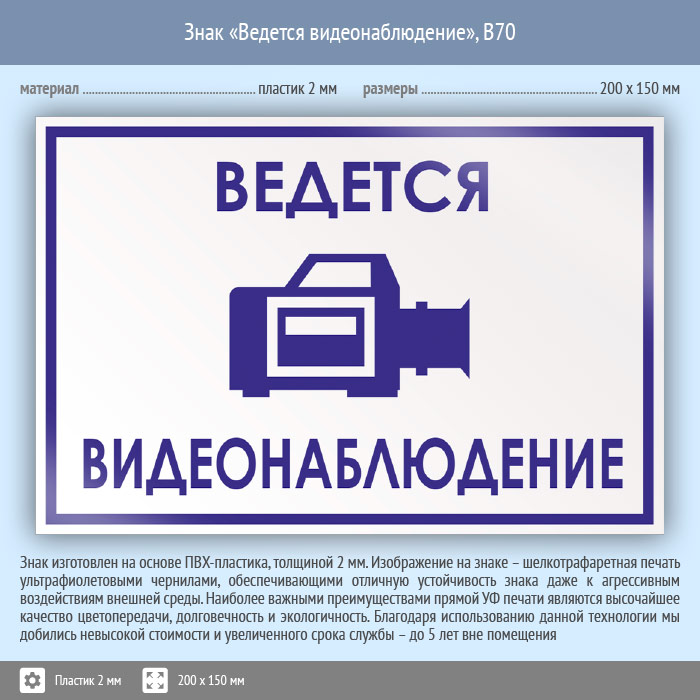 Знак «Ведется видеонаблюдение», B70 (пластик, 200х150 мм) в Волгограде купить