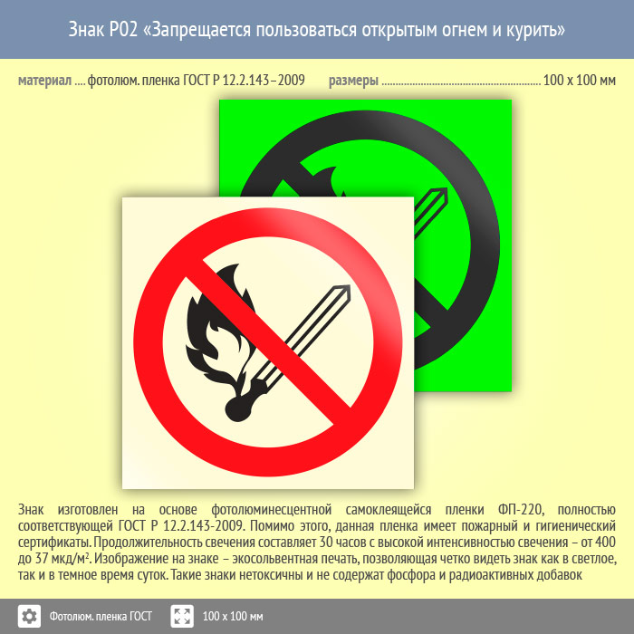 Знак P02 «Запрещается пользоваться открытым огнем и курить» (фотолюминесцентная пленка ГОСТ 34428-2018, 100х100 мм) в Волгограде купить