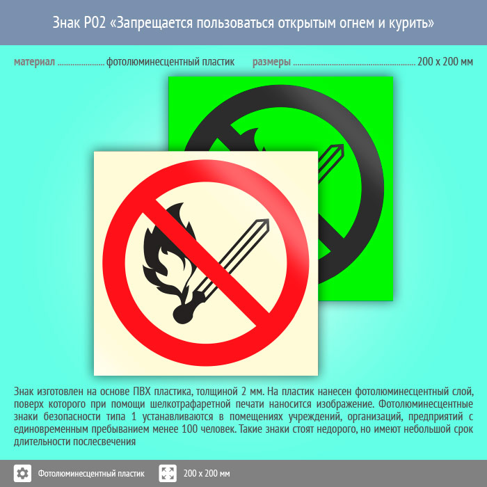 Знак P02 «Запрещается пользоваться открытым огнем и курить» (фотолюминесцентный пластик, 200х200 мм) в Волгограде купить